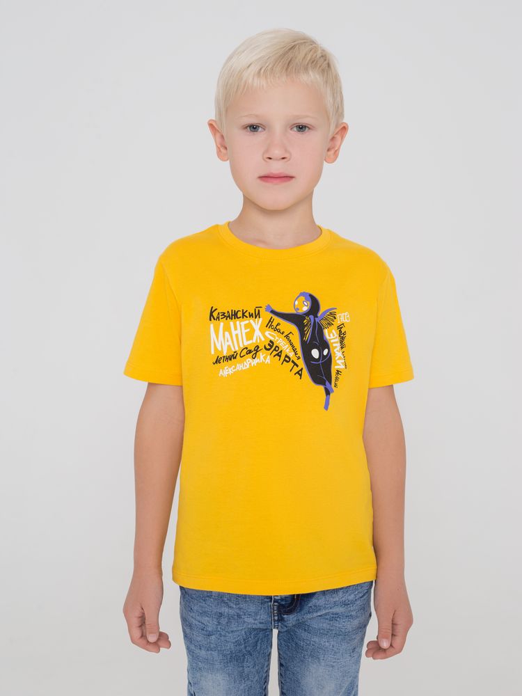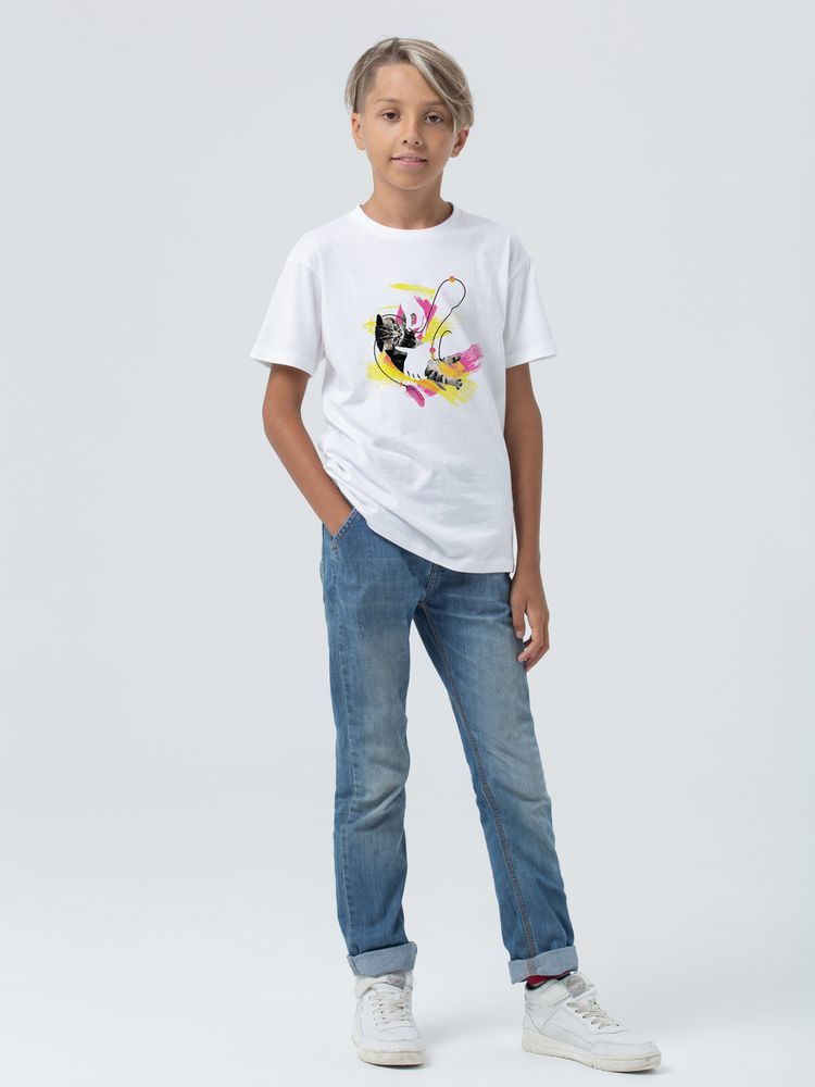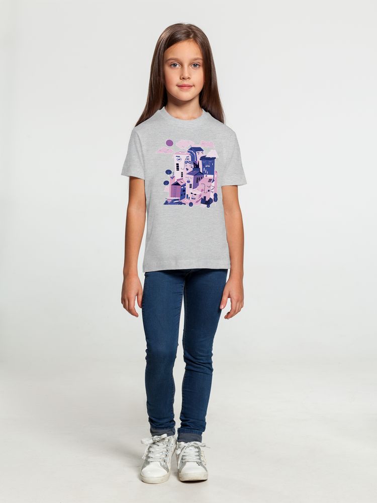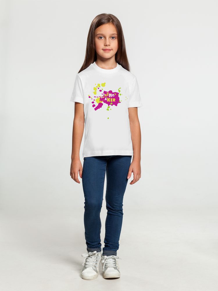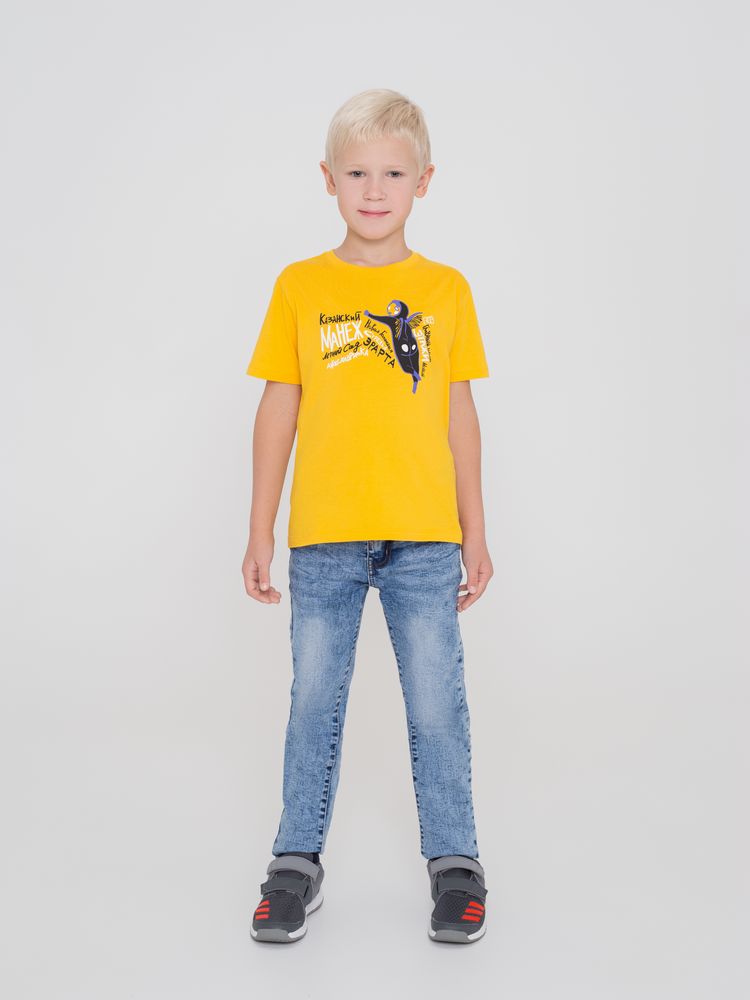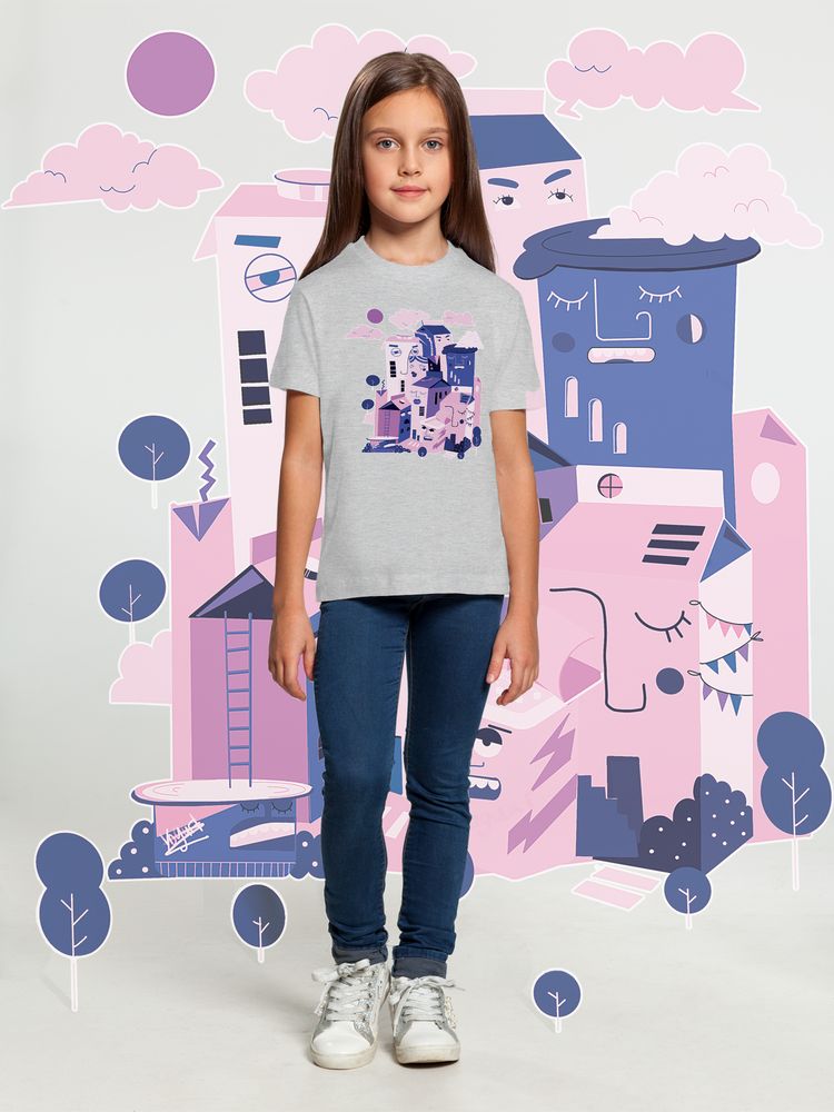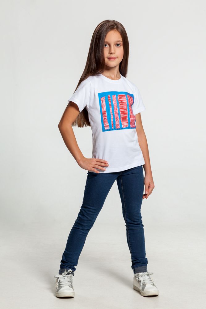 Кроеная детская футболка с круглым воротом-резинкой (рибана 1х1 с лайкрой). Высокое качество материалов: полотно джерси (кулирная гладь), прошедшее предварительную термоусадку; нить 30/1; особо гладкая гребенная пряжа. Активное крашение полотна.